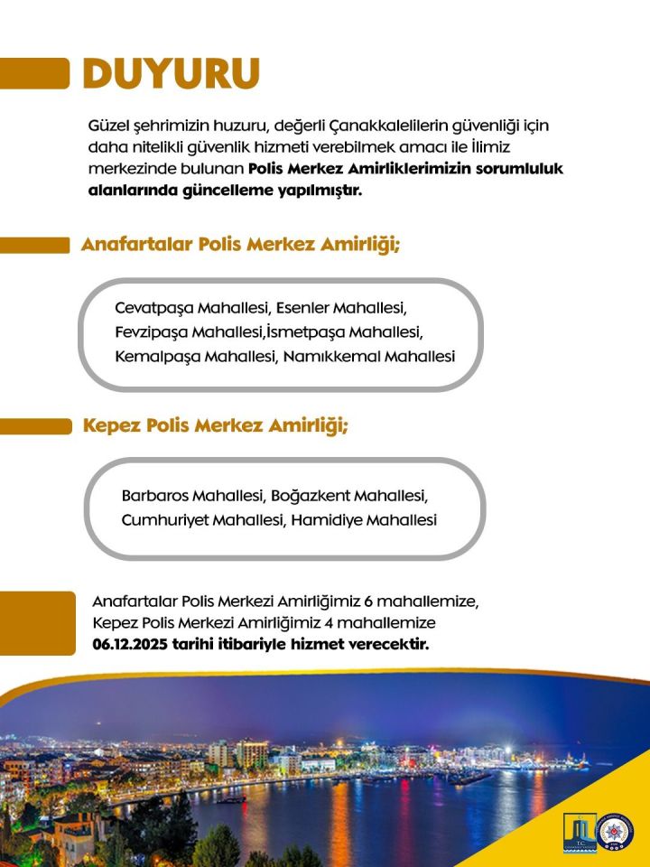 Anafartalar ve Kepez polis merkezi amirliklerinin sorumluluk alanlarında güncelleme yapıldı. Çanakkale Valiliğinden yapılan bilgilendirmeye göre güncelleme güvenlik hizmetlerinin daha etkin yürütülmesi amacıyla gerçekleştirildi.