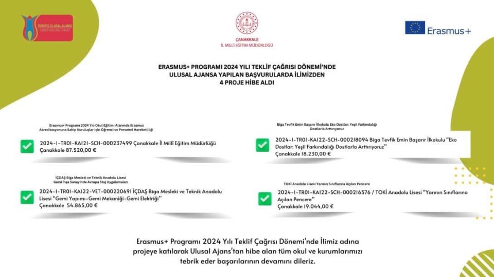 Erasmus+ Programı 2024 Yılı Teklif Çağrısı Dönemi'nde Ulusal Ajans'a yapılan başvurularda Çanakkale’den 4 okul hibe aldı.