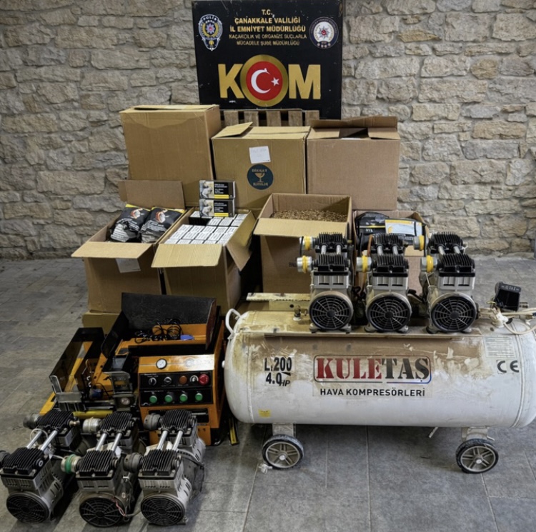 İl genelinde kaçakçılık faaliyetlerine yönelik yapılan çalışmalarda 2 şüpheliye ait bir ikamet ve bir işyerinde yapılan aramalarda 1 adet elektronik sigara sarma makinesinin yanı sıra 1 adet kompresör, 3 adet kompresör motoru, 198 bin 200 adet boş makaron, 14 bin 700 adet doldurulmuş makaron, 114 paket tütün ile 12 kilo açık kıyılmış tütün ele geçirildi.