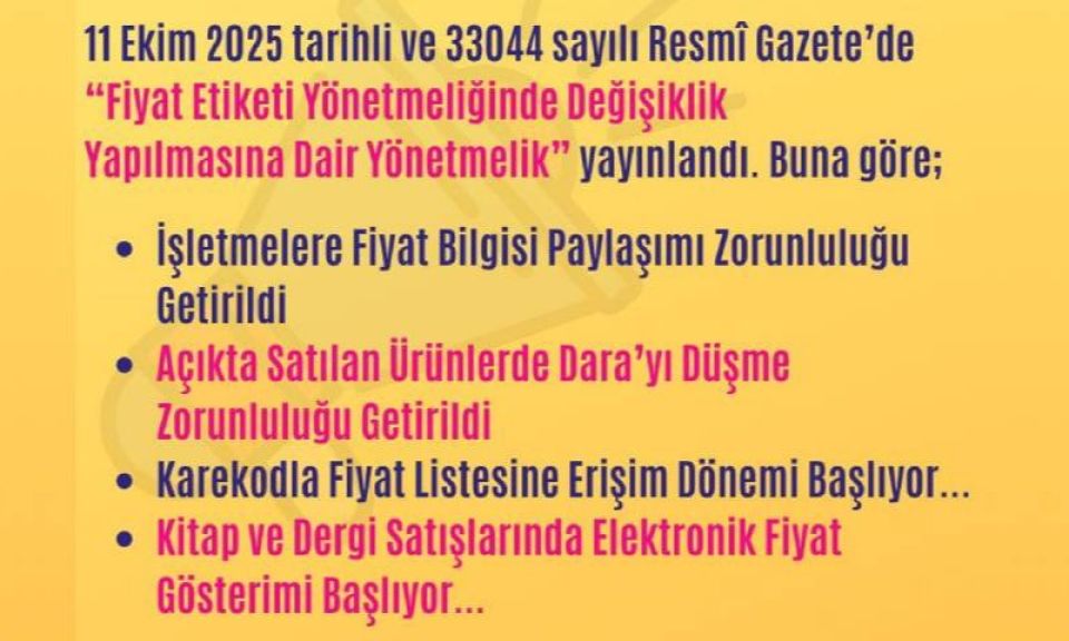 Ticaret Bakanlığı tarafından yapılan Fiyat Etiketi Yönetmeliği değişikliği ile lokanta, kafe, restoran, pastane ve benzeri işletmelere önemli yükümlülükler getirildi. Artık bu işyerlerinde fiyat listeleri; işyerinin giriş kapısının önüne ve masaların üstüne kolaylıkla görülebilir şekilde asılacak veya konulacak. Ayrıca, karekod (QR kod) aracılığıyla da dijital fiyat listesi sunulabilecek, ancak tüketici talep ederse basılı fiyat listesi verilmesi zorunlu olacak.