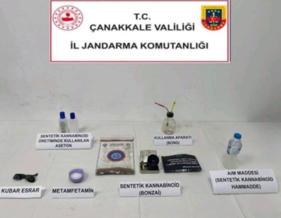 Yapılan aramalarda; 90 gr Sentetik Kannabinoid (Bonzai), 175 ml A/M Maddesi (Sentetik Kannabinoid Hammadde), 45 gr Metamfetamin, 40 adet Sentetik Ecza, 6 gr Kubar Esrar, 1 adet Hassas Terazi, 300 gr Sentetik Kannabinoid Yapımında Kullanılan Tütün, 780 ml Sentetik Kannabinoid Yapımında Kullanılan Aseton 23 adet Uyuşturucu Kullanma Aparatı ele geçirildi.