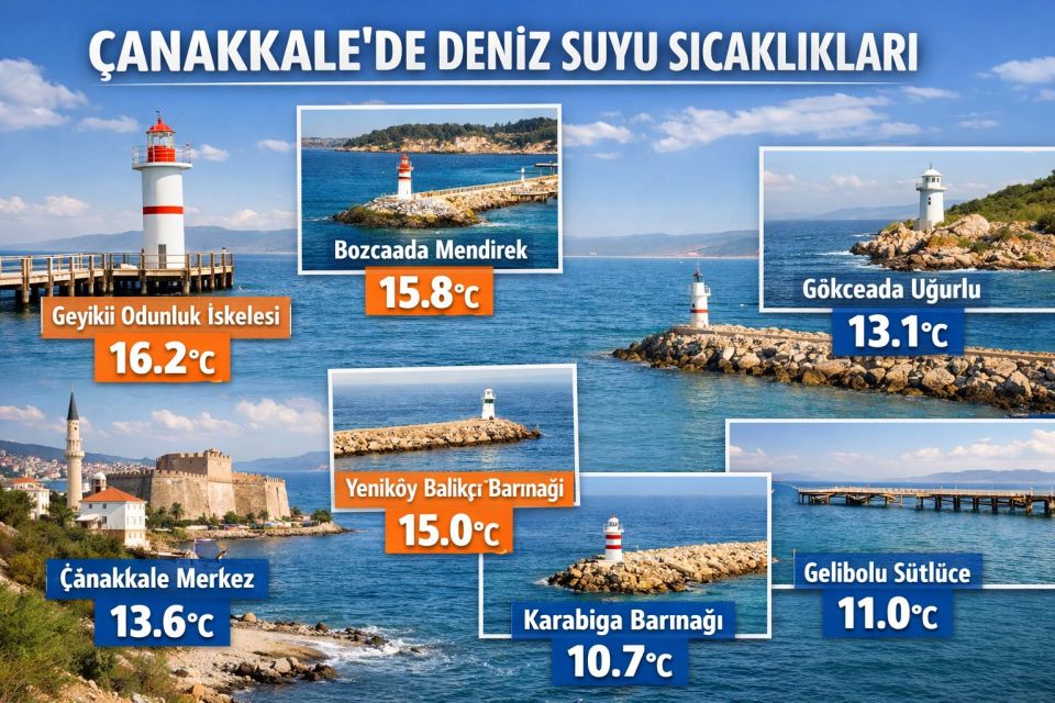 Çanakkale Merkez’de saat 09.00 itibarıyla yapılan ölçümde deniz suyu sıcaklığı 13,6 derece olarak kayıtlara geçti. Gökçeada Uğurlu Liman Feneri’nde 13,1 derece ölçülürken, Gelibolu Sütlüce Limanı Kuru İskele’de sıcaklık 11 derece oldu. Biga ilçesine bağlı Karabiga Barınağı Güney Mendirek Feneri’nde ise deniz suyu sıcaklığı 10,7 derece olarak belirlendi. Uzmanlar, ölçülen değerlerin mevsim normallerinin üzerinde seyrettiğine dikkat çekiyor.