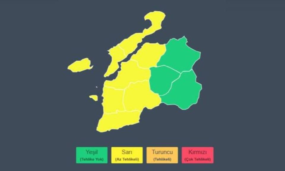 Sarı kodlu yapılan uyarıda bugün ve yarın için “21-50 kg/m2 sağanak ve gök gürültülü sağanak yağış beklendiğinden sel, su baskını, yıldırım, yerel dolu yağışı, yağış anında kuvvetli rüzgâr ve fırtına, kıyılarda hortum, ulaşımda aksamalar gibi olumsuzluklara karşı dikkatli ve tedbirli olunmalıdır.” ifadelerine yer verildi.