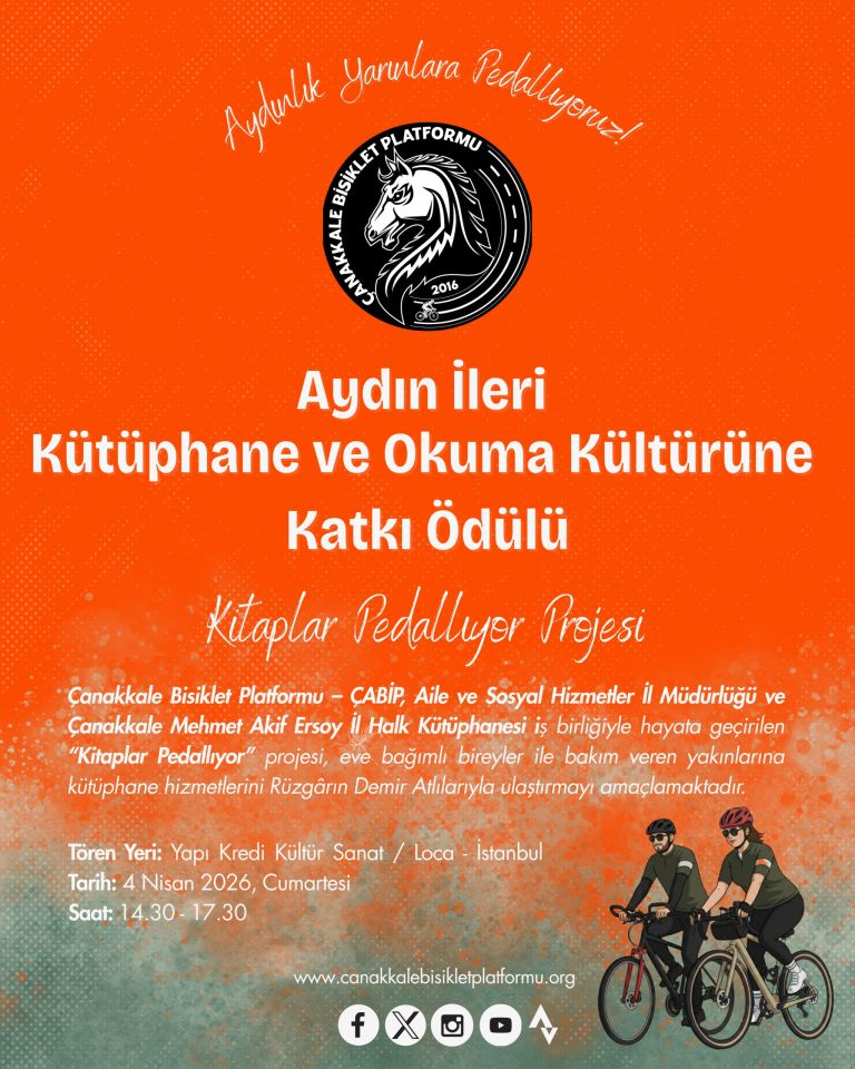 Çanakkale’de evden çıkmakta güçlük yaşayan vatandaşlar ile onlara bakım hizmeti veren kişilerin kitaplara daha kolay ulaşabilmesi amacıyla hayata geçirilen “Kitaplar Pedallıyor” projesi, Okul Kütüphanecileri Derneğinin merhum Aydın İleri adına verdiği ödüle layık görüldü.
