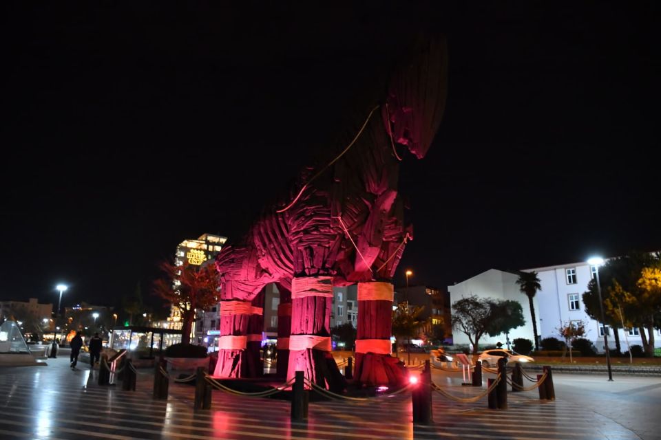 Çanakkale Belediyesi tarafından 15 Ekim Meme Kanseri Farkındalık Günü kapsamında Truva Atı ve Saat Kulesi’ni pembe renkte ışıklandırıldı.