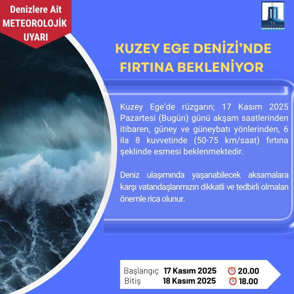 Kuzey Ege'de fırtına beklendiği konusunda kent halkını bilgilendiren Çanakkale Valiliği, deniz ulaşımında aksamalar yaşanabileceğini duyurdu.