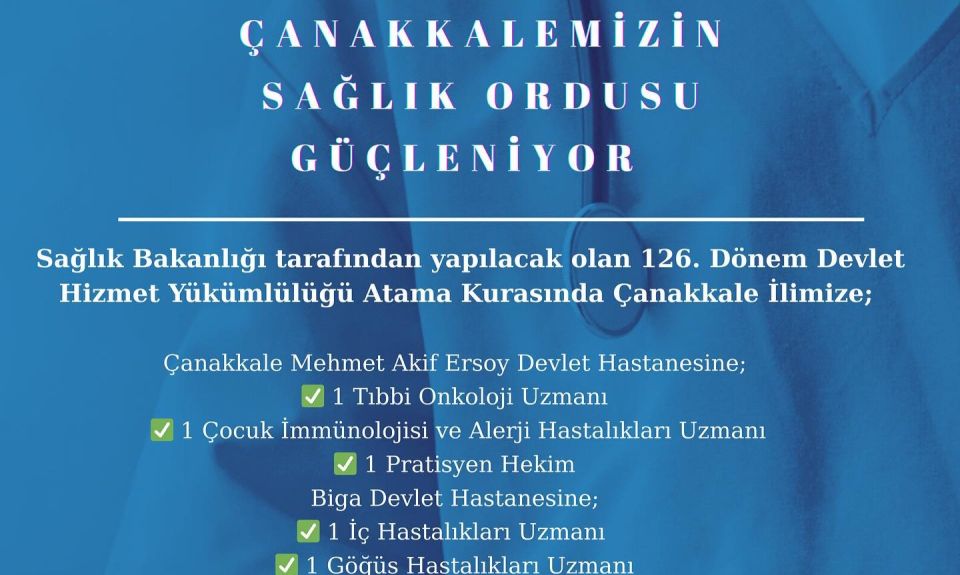 Sağlık Bakanlığı tarafından gerçekleştirilecek 126. Dönem Devlet Hizmet Yükümlülüğü Atama Kurası kapsamında, Çanakkale il genelindeki sağlık kuruluşlarına 4 uzman hekim ve 7 pratisyen hekim olmak üzere toplam 11 yeni hekim kadrosu tahsis edildi. Atamalar kapsamında Çanakkale Mehmet Akif Ersoy Devlet Hastanesi’ne 1 Tıbbi Onkoloji Uzmanı, 1 Çocuk İmmünolojisi ve Alerji Hastalıkları Uzmanı ile 1 pratisyen hekim görevlendirilecek. Biga Devlet Hastanesi’ne ise 1 İç Hastalıkları Uzmanı ve 1 Göğüs Hastalıkları Uzmanı atanacak.