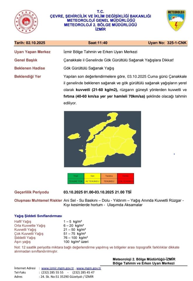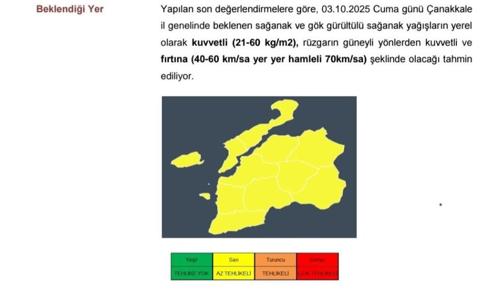 Meteoroloji Genel Müdürlüğü, yapılan son meteorolojik değerlendirmelere göre 3 Ekim 2025 Cuma günü Çanakkale il genelinde gök gürültülü sağanak yağışlar ve fırtına şeklinde esecek rüzgârlar konusunda halkı bilgilendirdi.
