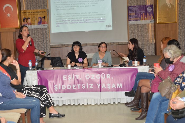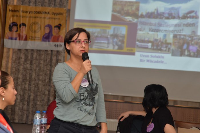 Gökçeçiçek Ayata ise EŞİK platformunun hayata geçiş aşamasına değinerek, "2 yılı aşkın süredir, İstanbul Sözleşmesi`ne saldırılar başlamıştı. Buna dair, ortak saldırılara karşı ortak mücadele zemini olarak EŞİK ortaya çıktı. Danıştay tarihinde de Türkiye tarihinde de dünya tarihinde de kadınların meydanlardan duruşma salonlarına kadar; taleplerinin nasıl arkasında durduklarını, hakları için nasıl mücadele gösterdiklerinin mücadele örneklerinden birisi" ifadelerine yer verdi.