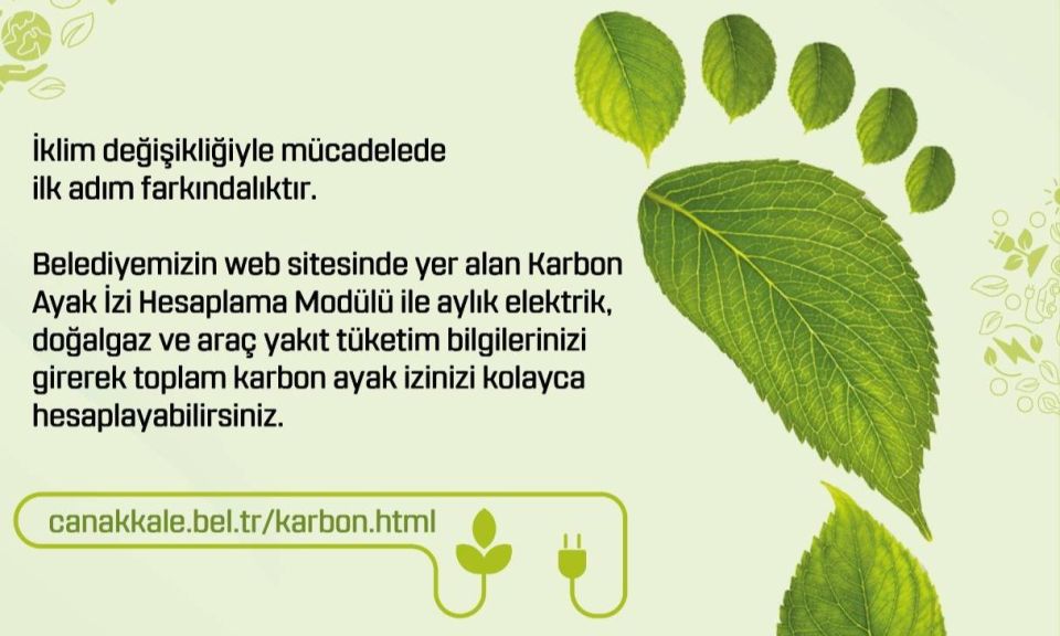 İklim değişikliğiyle mücadelede atılacak ilk ve en önemli adımın farkındalık olmasından hareketle, Çanakkale Belediyesi web sitesinde yer alan Karbon Ayak İzi Hesaplama Modülünü kullanarak hemşerilerimiz de artık kendi karbon salınımlarını kolayca hesaplayabilecek.