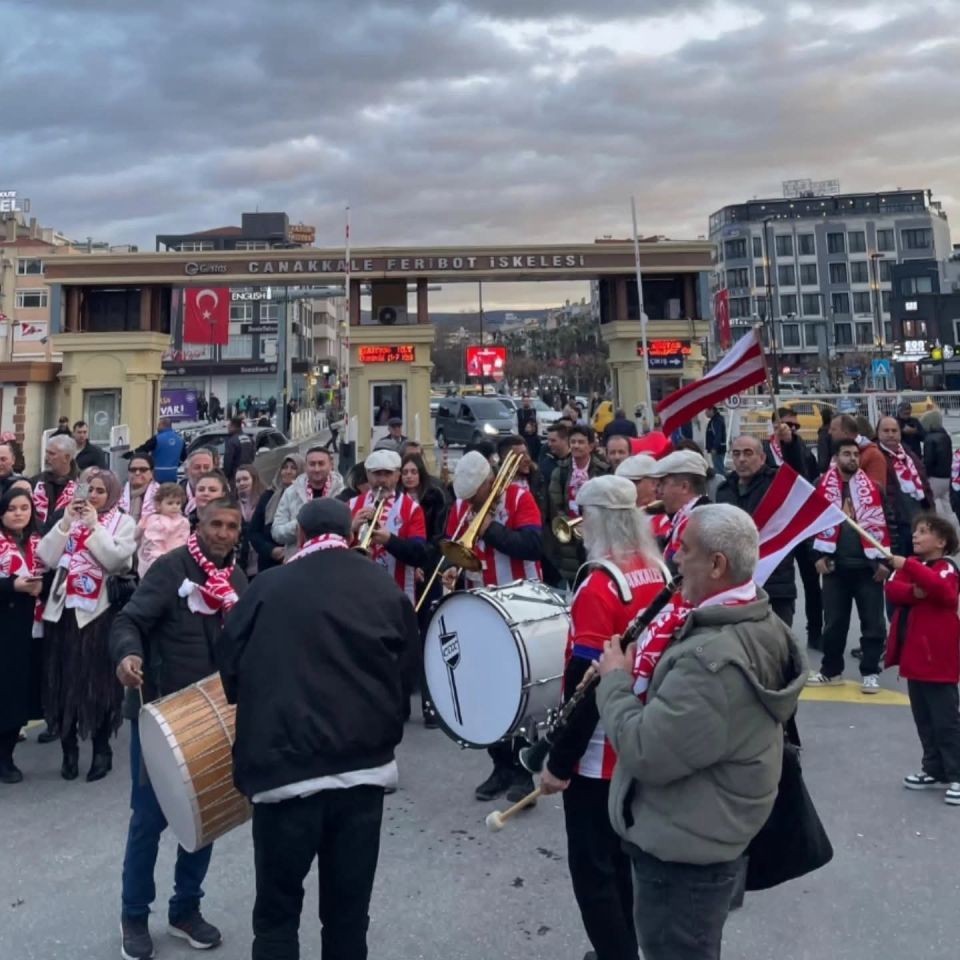 Saat 19.30’da gemiyle iskeleye yanaşan takım otobüsünü karşılamak için Çanakkale İskele Meydanı’nda toplanan binlerce taraftar, ellerinde bayraklar ve meşalelerle unutulmaz bir atmosfer oluşturdu. “Şampiyon Çanakkalespor” tezahüratlarının yankılandığı meydanda adeta karnaval havası yaşandı.