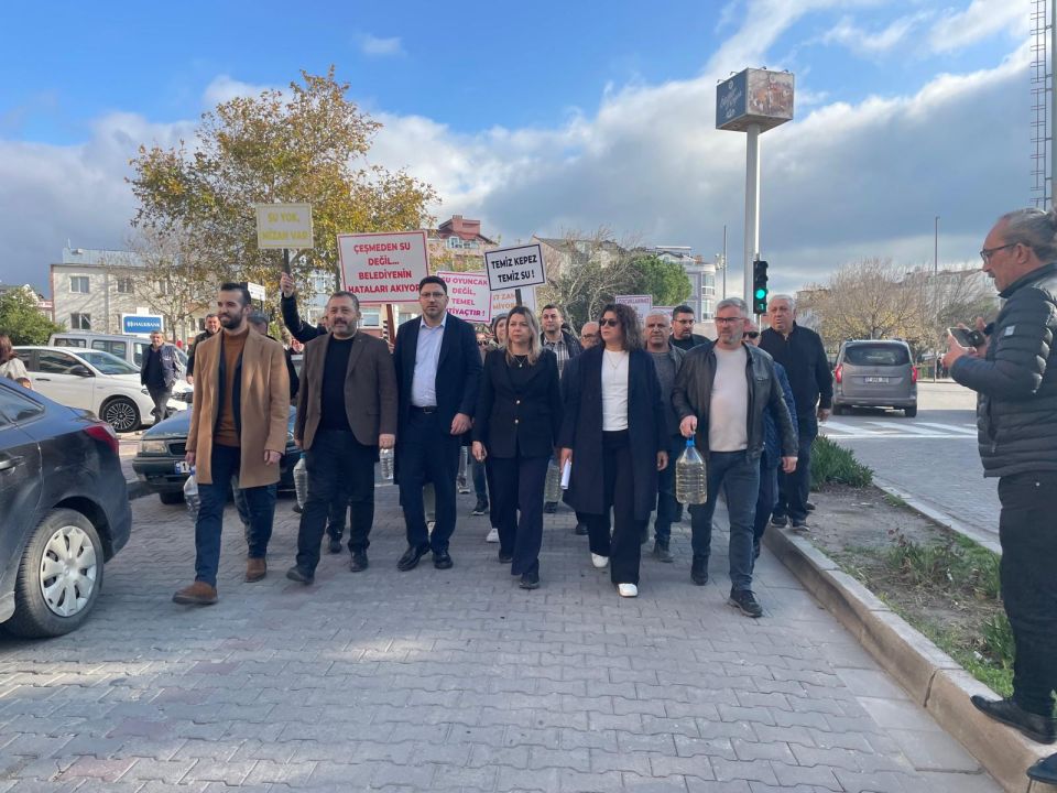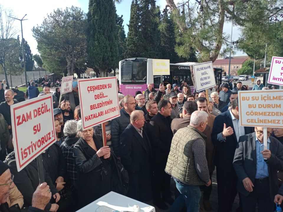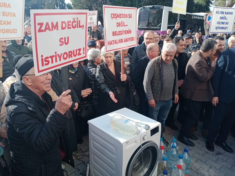 AK Parti Çanakkale Merkez İlçe Başkanı Recep Ragıp Barış, AK Parti Kepez Belde Başkanı Ömer Candan, AK Partili Çanakkale Belediye Meclisi Üyesi ve AK Parti İl Kadın Kolları Başkanı Özlem Karadayı, AK Parti İl Gençlik Kolları Başkanı Doğukan Deniz, parti üyeleri ve vatandaşların katıldığı eylem için belediye binası önüne Kepez’in kireçli suyu nedeniyle bozulan çamaşır makineleri, duş başlıkları ve musluk sularının doldurulduğu pet şişeler bırakıldı.