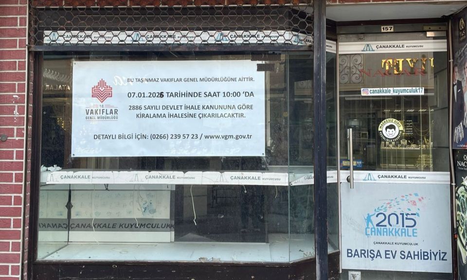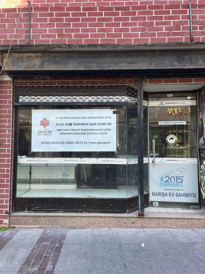 Vakıflar Genel Müdürlüğü’ne ait Çarşı Caddesinde bulunan bina, ihale ile kiralanacak. Çanakkale Merkez Kemalpaşa Çarşı Cad. No:157’de bulunan 30,15 m²’lik dükkân vasfındaki taşınmaz aylık 120.000 TL muhammen bedeli ile ihaleye çıkarıldı. Vakıflara ait Aynalı Çarşı içerisinde bulunan bir başka dükkânın aylık muhammen bedeli ise 25 bin TL olarak belirlendi.