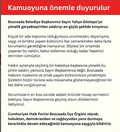 "Bozcaada Belediye Başkanımız Sayın Yahya Göztepe’ye yönelik gerçekleştirilen saldırıyı en güçlü şekilde kınıyoruz.