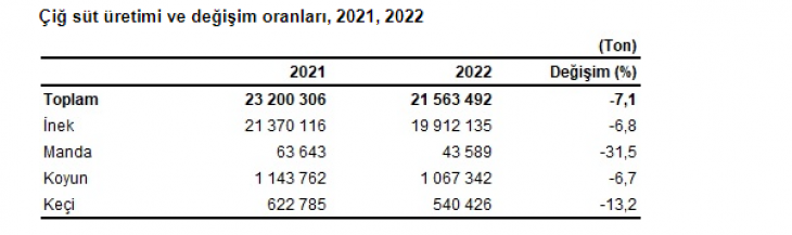 Çiğ süt üretim istatistikleri 2020 yılından itibaren Tarımsal İşletmelerde Hayvansal Üretim Araştırması`ndan elde edilmektedir. Buna göre, 2021 yılında 23 milyon 200 bin 306 ton olan çiğ süt üretim tahmini, 2022 yılında %7,1 azalarak 21 milyon 563 bin 492 ton oldu. Bir önceki yıla göre manda sütü üretimi %31,5, keçi sütü üretimi %13,2, inek sütü üretimi %6,8 ve koyun sütü üretimi %6,7 azaldı.