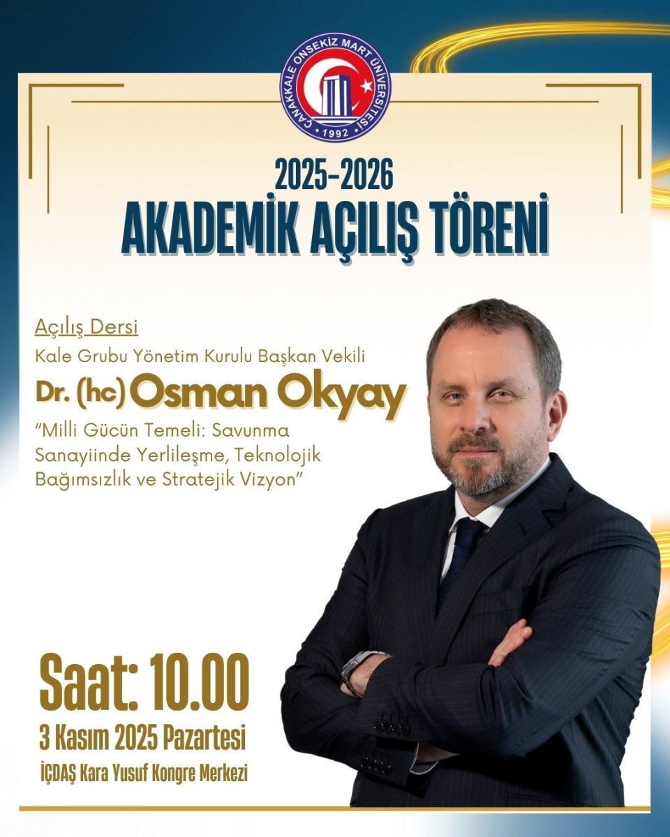 Çanakkale Onsekiz Mart Üniversitesi (ÇOMÜ), 2025-2026 akademik yılına anlamlı bir törenle “merhaba” demeye hazırlanıyor. Yeni akademik yılın açılış töreni, 3 Kasım 2025 Pazartesi günü saat 10.00’da ÇOMÜ İÇDAŞ Kara Yusuf Kongre Merkezi'nde gerçekleştirilecek.