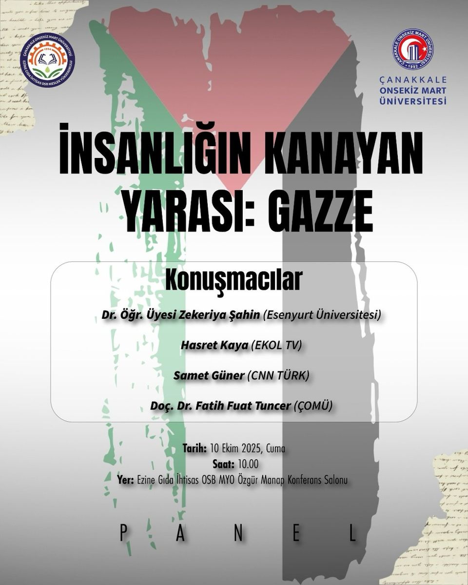 Çanakkale Onsekiz Mart Üniversitesi (ÇOMÜ) Ezine Gıda İhtisas OSB Meslek Yüksekokulu, insanlığın en acı yaralarından biri olan Gazze’de yaşanan trajediye dikkat çekmek amacıyla anlamlı bir etkinliğe imza atıyor. “İnsanlığın Kanayan Yarası: Gazze” başlıklı panel, 10 Ekim 2025 Cuma günü saat 10.00’da Ezine Gıda İhtisas OSB MYO Özgür Manap Konferans Salonu’nda gerçekleştirilecek.