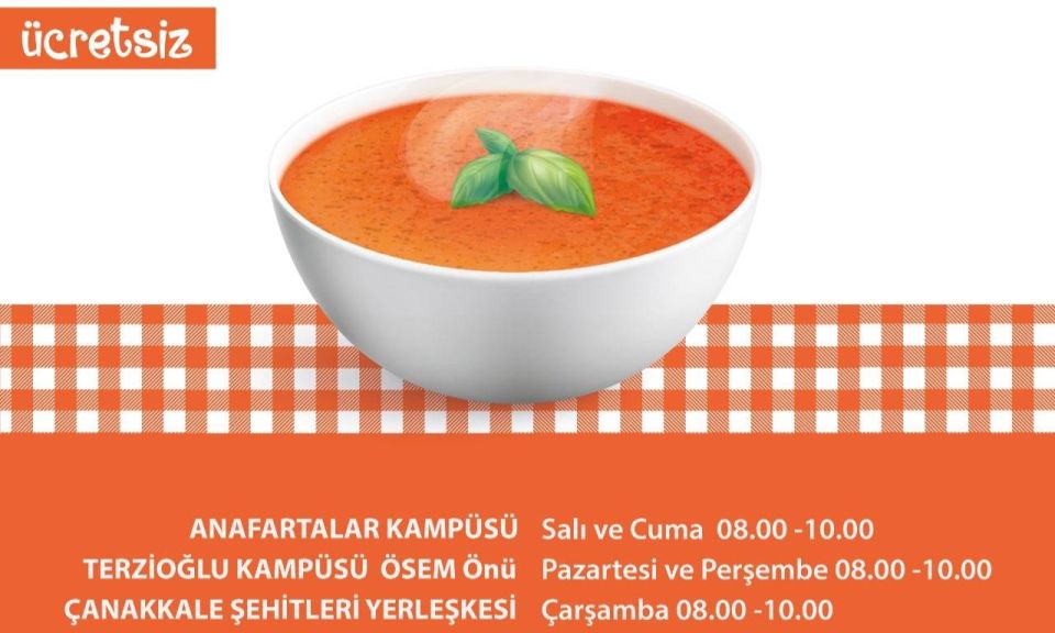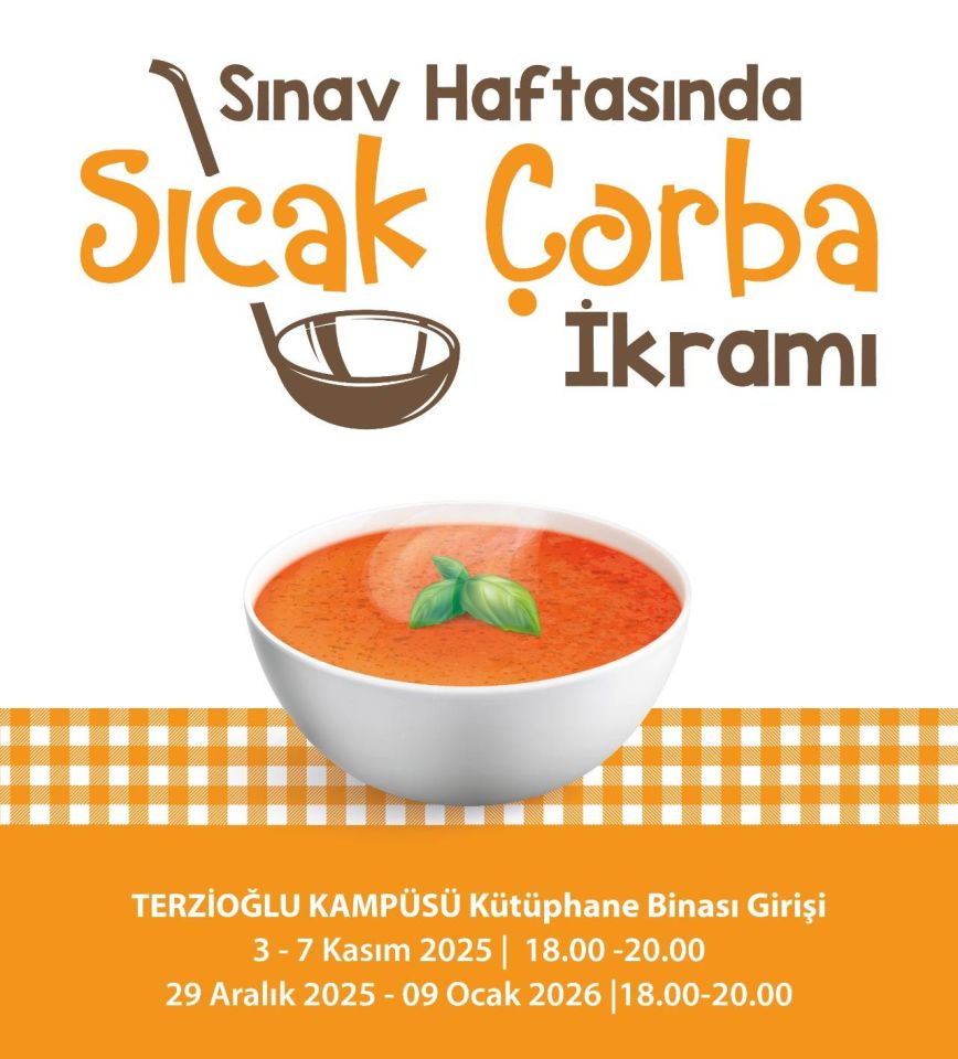 Ayrıca, 3-7 Kasım 2025 tarihleri arasındaki sınav haftası ile 29 Aralık 2025 – 9 Ocak 2026 tarihleri arasındaki sınav haftasında, 18.00-20.00 saatleri arasında, Terzioğlu Yerleşkesi kütüphane önünde de sıcak çorba ikramı yapılacak.