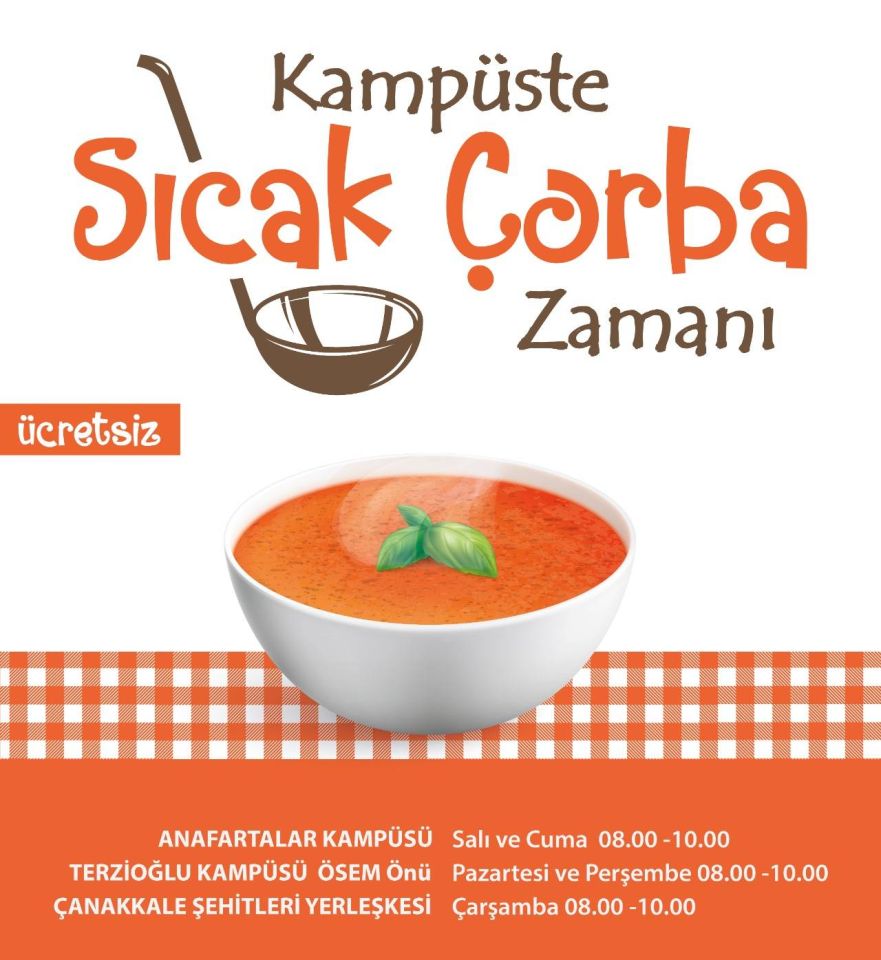 Öğrencilerden yoğun ilgi gören sıcak çorba ikramları, Terzioğlu Yerleşkesi ÖSEM önünde pazartesi ve perşembe günleri, Anafartalar Kampüsünde salı ve cuma günleri, Çanakkale Şehitleri Yerleşkesinde ise çarşamba günleri olmak üzere, 08.00-10.00 saatleri arasında gerçekleşecek.