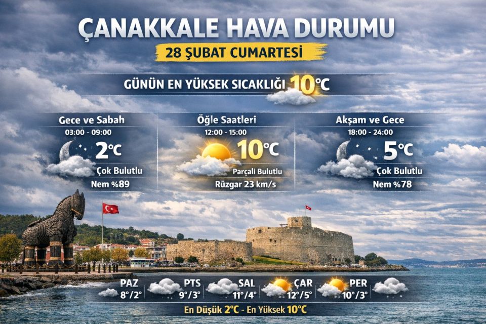 28 Şubat Cumartesi günü genel olarak parçalı bulutlu bir hava tahmin ediliyor. Günün en düşük sıcaklığı 2 derece, en yüksek sıcaklığı ise 10 derece olacak.