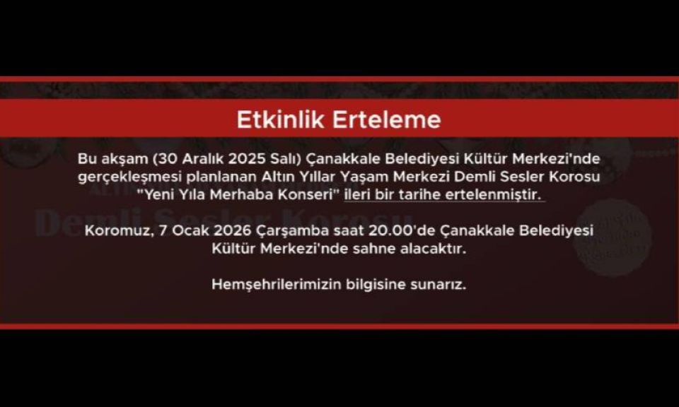 Çanakkale Belediyesi Kültür Merkezi’nde bu akşam (30 Aralık Salı) sahne alması beklenen Altın Yıllar Yaşam Merkezi Demli Sesler Korosu’nun konseri programında değişikliğe gidildi.