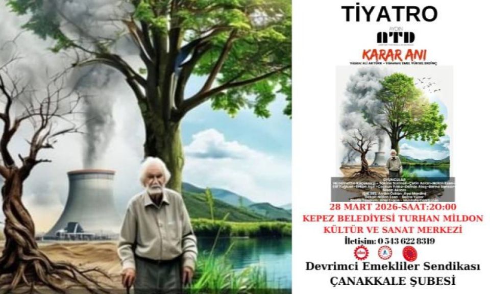 Devrimci Emekliler Sendikası Çanakkale Şubesinin organize ettiği, Aydın Amatör Tiyatrocular Derneği Üyelerinin oynadığı, "KARAR ANI" adlı eser, 28 Mart 2026 Cumartesi günü akşamı saat 20.00'da Kepez Belediyesi Turhan Mildon Kültür ve Sanat Merkezinde sahnelenecek.