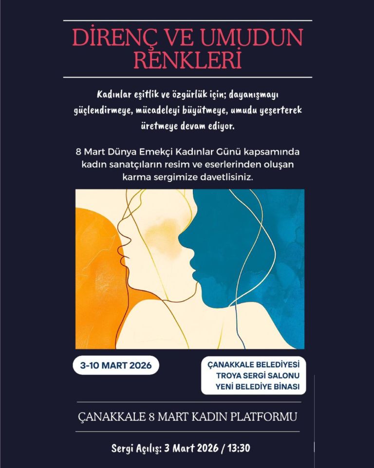 Çanakkale 8 Mart Kadın Platformu'nun Çanakkale Belediyesi destekleriyle hazırladığı Direnç ve Umudun renkleri isimli karma sergi, 3 Mart 2026 Salı günü açılıyor. Çanakkale Belediye binası Troya Sergi Salonunda saat 13:30'da açılışı gerçekleştirilecek olan sergide kadın sanatçıların resim ve eserleri yer alacak.