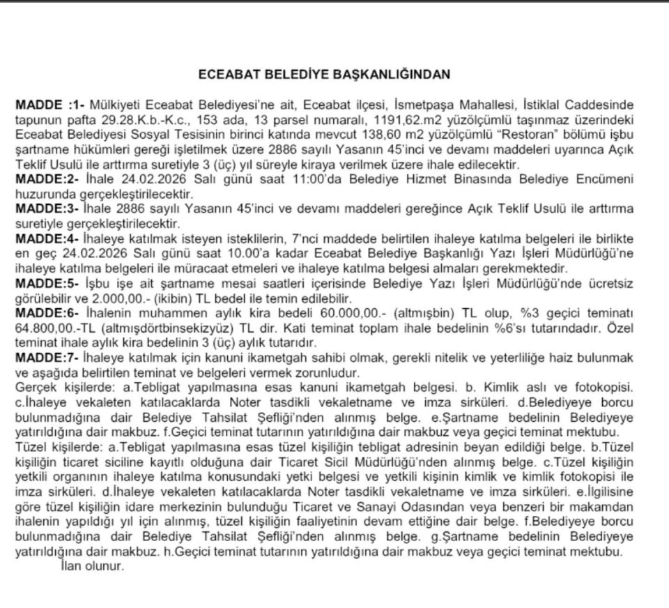 "Mülkiyeti Belediyemize ait, Eceabat ilçesi İsmetpaşa Mahallesi İstiklal Caddesi’nde bulunan ve tapunun 29.28.K.b.-K.c., 153 ada, 13 parsel numaralı, 1191,62 m² yüzölçümlü taşınmaz üzerindeki Eceabat Belediyesi Sosyal Tesisinin 1. katında yer alan 138,60 m² büyüklüğündeki “Restoran” bölümü, 2886 sayılı Devlet İhale Kanunu’nun 45. maddesi gereğince Açık Teklif Usulü ile artırma suretiyle 3 (üç) yıl süreyle kiraya verilecektir.