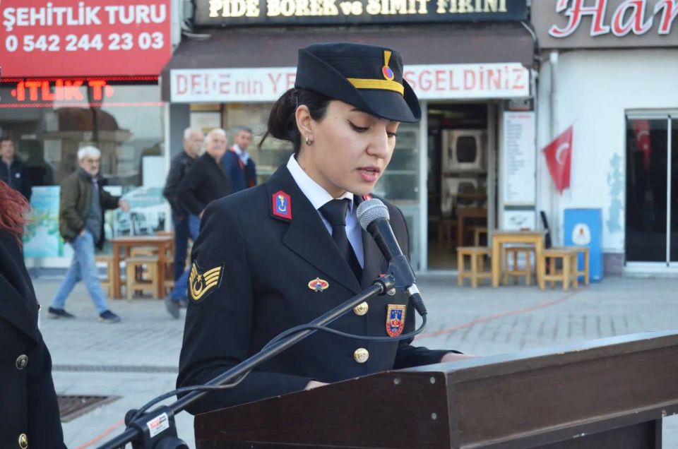 Çelenklerin sunulması, saygı duruşu ve İstiklâl Marşının okunmasının ardından Jandarma Astsubay Üst Çavuş Merve Görgülü tarafından günün anlam ve önemine dair bir konuşma yapıldı.