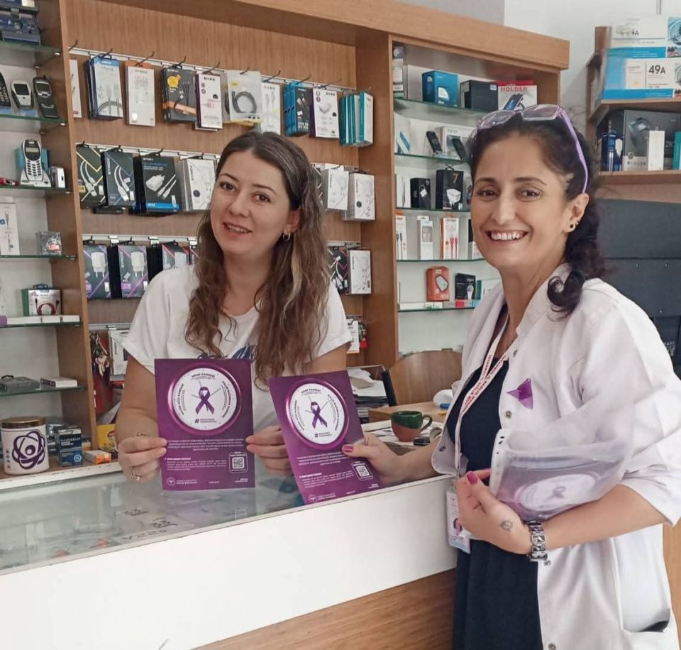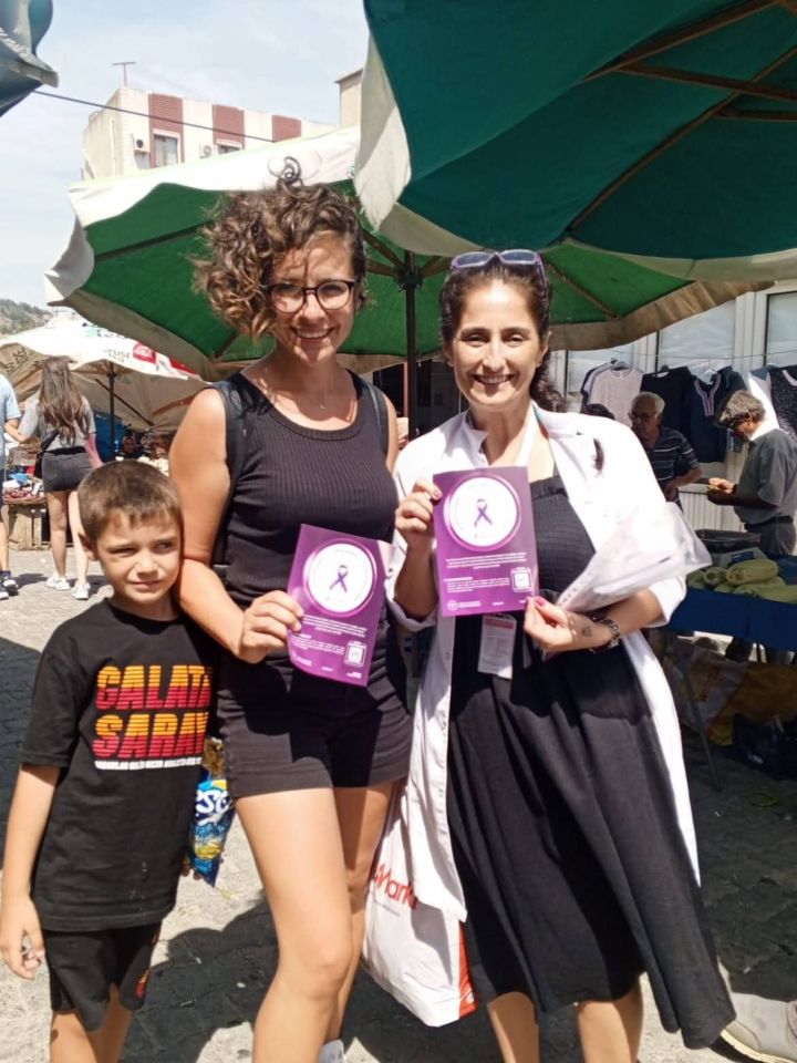 Etkinlik kapsamında, merkezin başkanı Uzm. Dr. Müge Meriç liderliğindeki ekip, mor kurdeleler takarak ilçe sakinlerine ulaşarak ücretsiz kanser taramaları hakkında bilgi verdi.