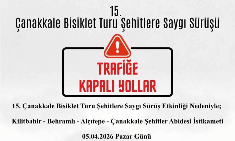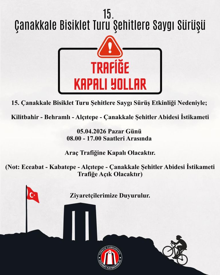 Eceabat Kaymakamlığı, 5 Nisan 2026 Pazar (yarın) düzenlenecek olan 15. Çanakkale Bisiklet Turu Şehitlere Saygı Sürüşü dolayısıyla ilçede bazı yolların kapalı olacağını duyurdu.