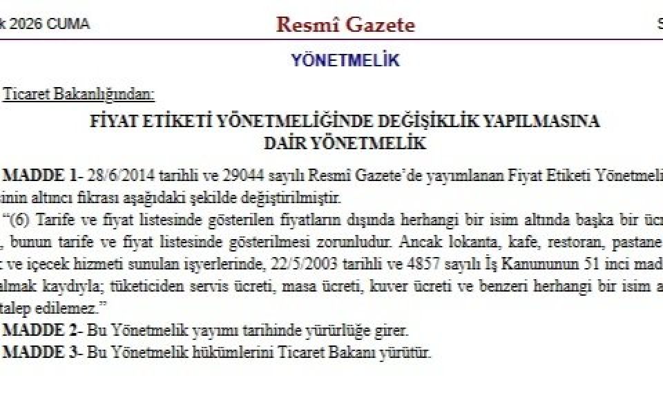 30 Ocak 2026 itibarıyla Türkiye genelinde olduğu gibi Çanakkale’de de tüm yiyecek ve içecek işletmelerini kapsayan önemli bir düzenleme yürürlüğe girdi. Ticaret Bakanlığı’nın Fiyat Etiketi Yönetmeliği’nde yaptığı değişiklikle birlikte, işletmelerin menüde yer alan ürün bedeli dışında herhangi bir ad altında ek ücret talep etmesine son verildi.