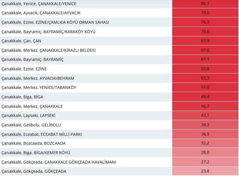 Çanakkale Merkez ve ilçelerinde gök gürültülü ve sağanak yağış etkisini sürdürüyor. Bugün de devam etmesi beklenen yağmurdan en çok nasibini alan ilçe ise Yenice oldu. Yenice'de metrekareye 86.1 kilogram yağış düşerken; onu 79 kilogram ile Ayvacık, 76,3 kilogram ile Ezine Çamlıca köyü orman sahası ve 75 kilogram ile Bayramiç'in Karaköy köyü takip ediyor.