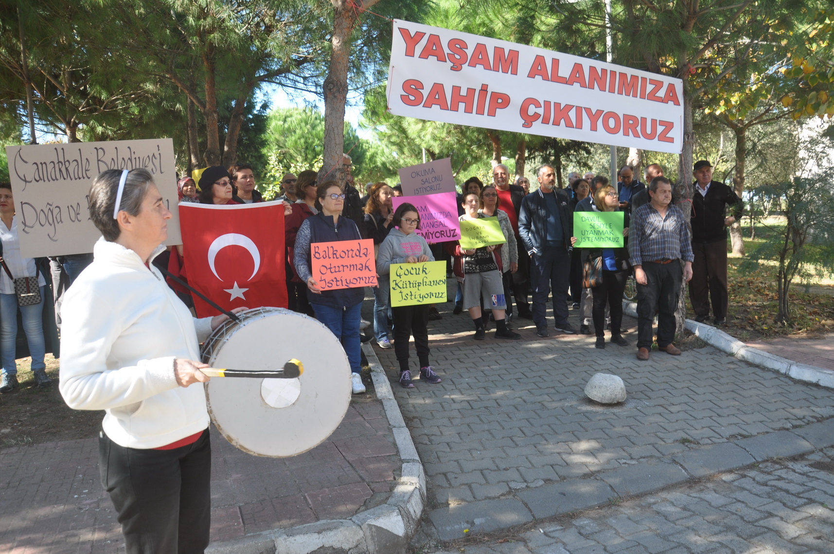 Çanakkale Belediyesine bağlı Özgürlük Parkı Çay Bahçesi civarında yer alan ağaçlık alan, vatandaşların sabrını taşırdı. Yakın civarda bulunan Barışkent sitesi sakinleri, ağaçlık alanda yaşanan olumsuzlukların artık durması yönünde basın açıklaması düzenlediler. Vatandaşlar, Çanakkale Belediye Meclisi tarafından alanın daha önce belli bir saate kadar kullanıma açıldığını fakat, sorumsuz ve duyarsız vatandaşların bu karara uymayıp ağaçlık alanda sabaha kadar eğlendiğini söyledi. Vatandaşlar, alanın sosyal, kültürel ve sanatsal olara değerlendirilmesi gerektiğini söylediler. Çocuklar için eğitim alanları, serbest spor alanları vb. yapılanmanın oluşması gibi önerilerde bulunan vatandaşlar, yetkililerin bu soruna birçağre bulması gerektiğini belirttiler. Son derece uygunsuz davranışların da yaşandığını söylen vatandaşlar, silah sesleri, geç saatte gelen mangal kokuları, bağırmalar duymak istemediklerini belirterek; “Çanakkale Belediyesi, 2013 yılında belediye meclis kararı ile ‘Piknik Sahası’ ilan ettiği bu güzide alanda yaşananlardan en çok etkilenen çevre sakinlerinin görüşlerini ve önerilerini göz ardı etmemelidir. 2012’den buyana Özgürlük Parkı ve Sağlıklı Yaşam Parkı arasında kalan arazi için çevre sakinleri olarak yapmış olduğumuz önerilerin dikkate alınmaması ve neticesinde yaşananlar bölgenin huzurunu olumsuz etkilemiştir. Belediyemizin mesire alanı olarak belirlediği bu ağaçlık alan, benzerlerine aykırı şekilde çevre halkına zarar vermeye başlamıştır. Özellikle Barışkent 1’inci ve 3’üncü Ada sakinleri olmak üzere bölgede yaşayan vatandaşlar geçen süre içerisinde park yeri kavgasından, sabaha kadar davul zurna çaldırmaya kadar çok çeşit huzur bozan eyleme maruz kalmaktadır. Özellikle parkta alkol aldıktan sonra motosiklet ile yapılan yarışlar ve arabalar ile drift tabir edilen trafik ve can güvenliğini tehdit etmektedir. Mahallemizin bazı sakinleri kendilerince tedbir almak istemiş olsalar da bunlar farklı sakinleri tarafından engellenmiştir. Gün içerisinde mangal dumanına ve kokusuna maruz kalan çevre sakinleri balkonlarını kullanamaz, camlarını dahi açamaz hale gelmiştir. Alkollü sürücüler parkı halindeki araçlarımıza çarparak maddi zarar vermekte ve alkollü araçta kullanarak çocuklarımız başta olmak üzere vatandaşların hayatlarını tehlikeye atmaktadırlar. Parkta havaya veya birbirlerine karşı ateşleme silah kullanana bazı magandalar, evimizin cam kenarında oturmayı imkansız hale getirmiş, huzur bırakmamıştır. Ayrıca bu parkta mahallemiz sakinlerini rahatsız eden ve huzurunu kaçıran her türlü davranış Çanakkale Belediyesi Zabıta Müdürlüğü Emir ve Yasaklar Yönetmeliği ile kanunen de yasaklanmıştır” denildi.