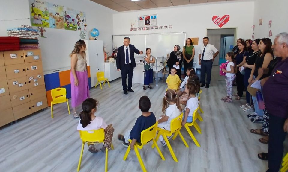 Ezine’de okul öncesi ve 1. sınıf öğrencileri, yeni eğitim-öğretim yılına “Uyum Haftası” ile adım attı. İlçe Milli Eğitim Müdürü Efrail Sancar öğrencileri ve velileri yalnız bırakmayarak onların heyecanına ortak oldu.