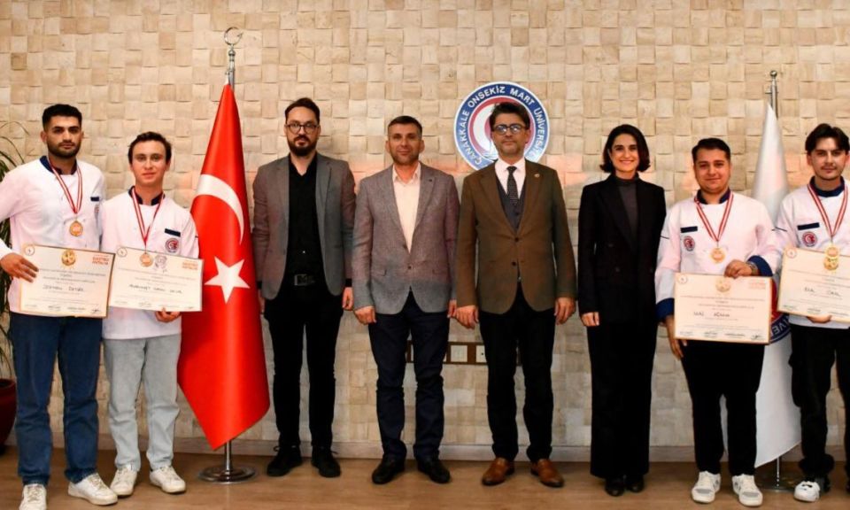 Çanakkale Onsekiz Mart Üniversitesi Gökçeada Uygulamalı Bilimler Yüksekokulu Gastronomi ve Mutfak Sanatları Bölümü öğrencileri, GastroAntalya 2025 yarışmalarında kazandıkları madalyalar sonrasında ÇOMÜ Rektörü Prof. Dr. R. Cüneyt Erenoğlu’nu makamında ziyaret ettiler. Ziyarete, Yüksekokul Müdürü Dr. Öğr. Üyesi Hande Kandur Arslan, Müdür Yardımcısı Öğr. Gör. Özkan Yazar, Arş. Gör. Necati Karakaş ve çeşitli kategorilerde derece elde eden öğrenciler katıldı.