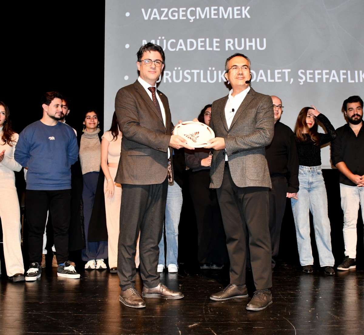 Öğrencilere risk almaları ve hayallerinden vazgeçmemeleri gerektiğinin altını çizen Kale Seramik Genel Müdür Yardımcısı Süleyman Soysal’a, ÇOMÜ Rektörü Prof. Dr. R. Cüneyt Erenoğlu tarafından hediye ve Güzel Sanatlar Fakültesi Dekanı Prof. Dr. Didem Çatal tarafından teşekkür belgesi takdim edildi.