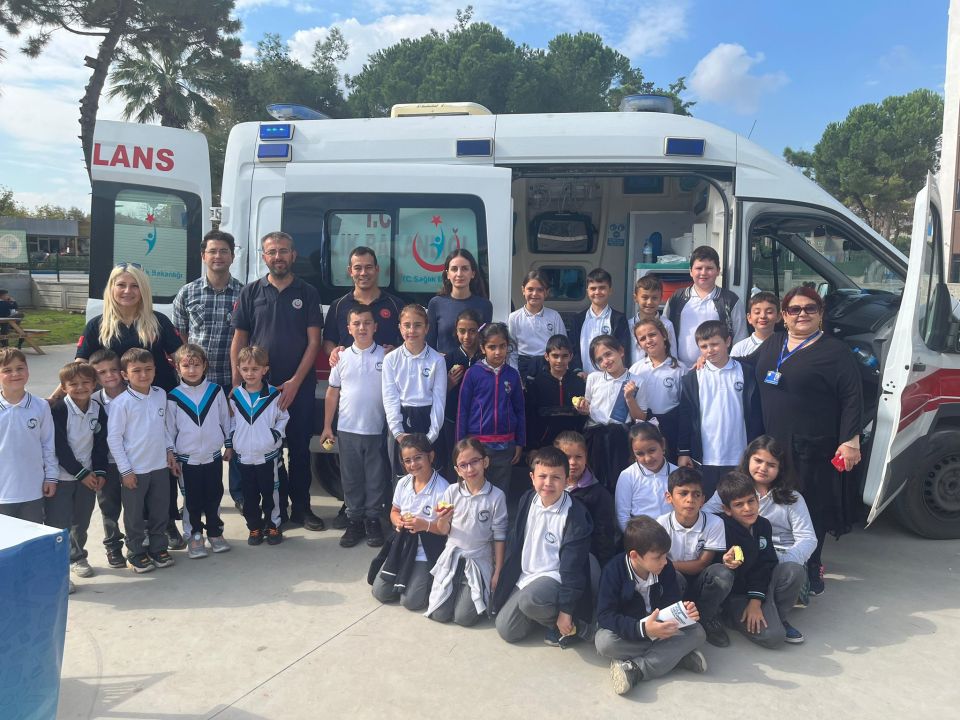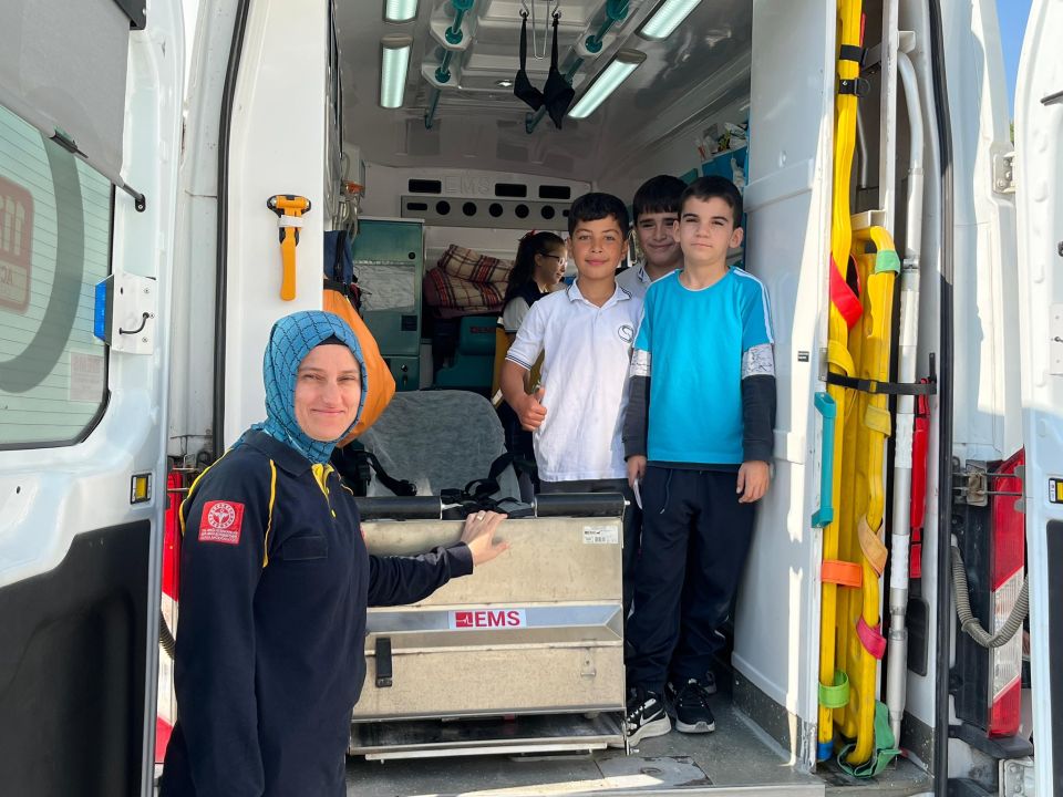 Öğrenciler, sahada kullanılan 112 Acil Ambulans ve UMKE Arama Kurtarma araçlarını yakından tanıma fırsatı buldu.