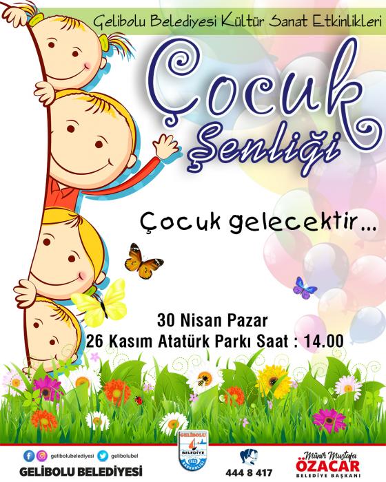 Gelibolu Belediyesi, Gelibolu Sanat Derneği eğitmen ve öğrencilerinin hazırladığı Çocuk Şenliği`ne vatandaşları davet etti. Etkinlik, 30 Nisan tarihinde, 14:00`da Gazi Süleyman Paşa Mahallesi 26 Kasım Atatürk Parkı`nda gerçekleşecek.