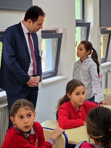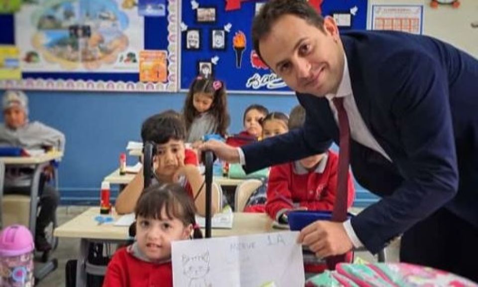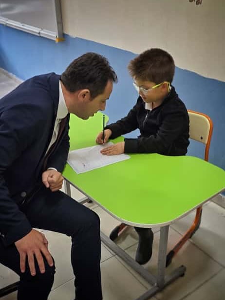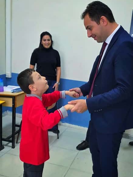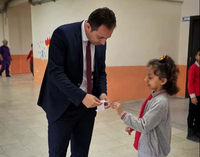 Gelibolu İlçe Millî Eğitim Müdürü Kadir Aydın, 26 Kasım İlkokulu’nu ziyaret ederek hem öğrencilerle hem de okul yönetimi ve öğretmenlerle bir araya geldi. Ziyaret kapsamında SMA Tip 1 rahatsızlığı tedavisini tamamlayarak sağlığına kavuşan ve 1. sınıfa başlayan Merve Tekin’in sınıfına konuk olan Müdür Aydın, Merve’nin sınıf başkanlığı seçimlerine adaylık açıklamasını dinledi ve hazırladığı afişi inceledi.