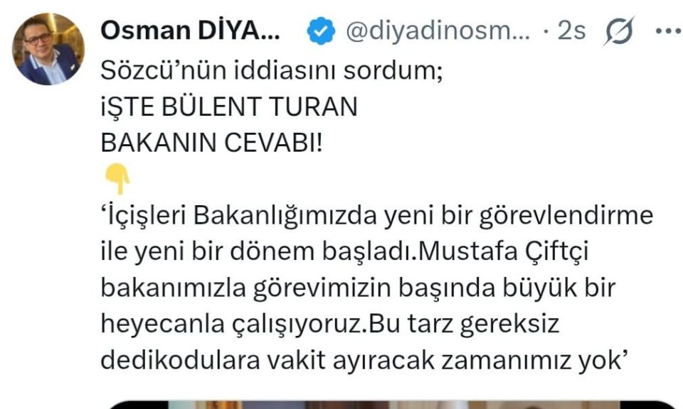 Gazeteci Osman Diyadin, Bülent Turan ile yaptığı görüşmenin detaylarını paylaşırken, Turan’ın tamamen Bakanlık gündemine ve saha çalışmalarına yoğunlaştığını ifade etti. Turan’ın özellikle düzensiz göçle mücadele ve güvenlik politikaları konusundaki mesaisine ara vermeden devam ettiği öğrenildi.