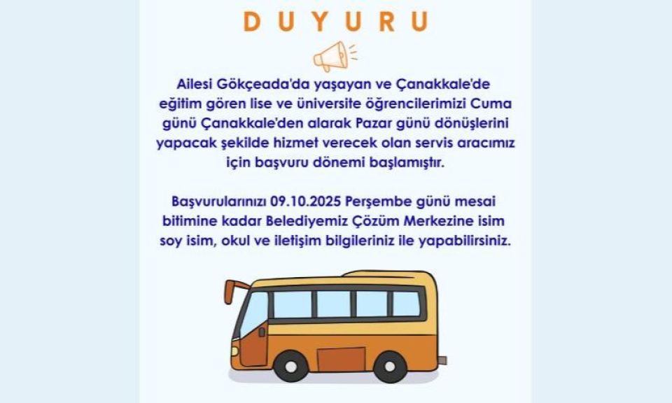 Gökçeada Belediyesi sosyal medya hesapları üzerinden yapılan bilgilendirmeye göre; ailesi Gökçeada'da yaşayan ve Çanakkale'de eğitim gören lise ve üniversite öğrencilerini Cuma günü Çanakkale'den alarak Pazar günü dönüşlerini yapacak şekilde hizmet verecek olan ücretsiz servis aracı için başvuru dönemi başladı.
