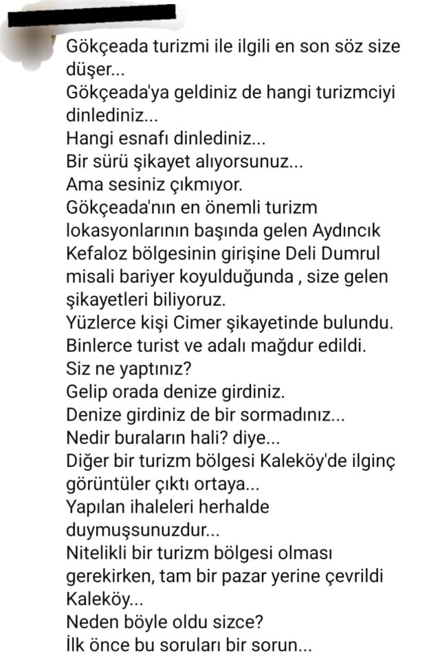 Bu açıklamaların ardından tartışma sosyal medyada ve ada kamuoyunda geniş yankı buldu. Çok sayıda Gökçeadalı, toplantı davetinden ziyade belediyenin son dönemdeki uygulamalarını gündeme taşıdı. Vatandaşlar, özellikle Aydıncık Kefaloz bölgesine yerleştirilen bariyerler, 3 kez iptal edilen ihaleler ve Kaleköy’deki turizm düzenlemelerine dikkat çektiler.