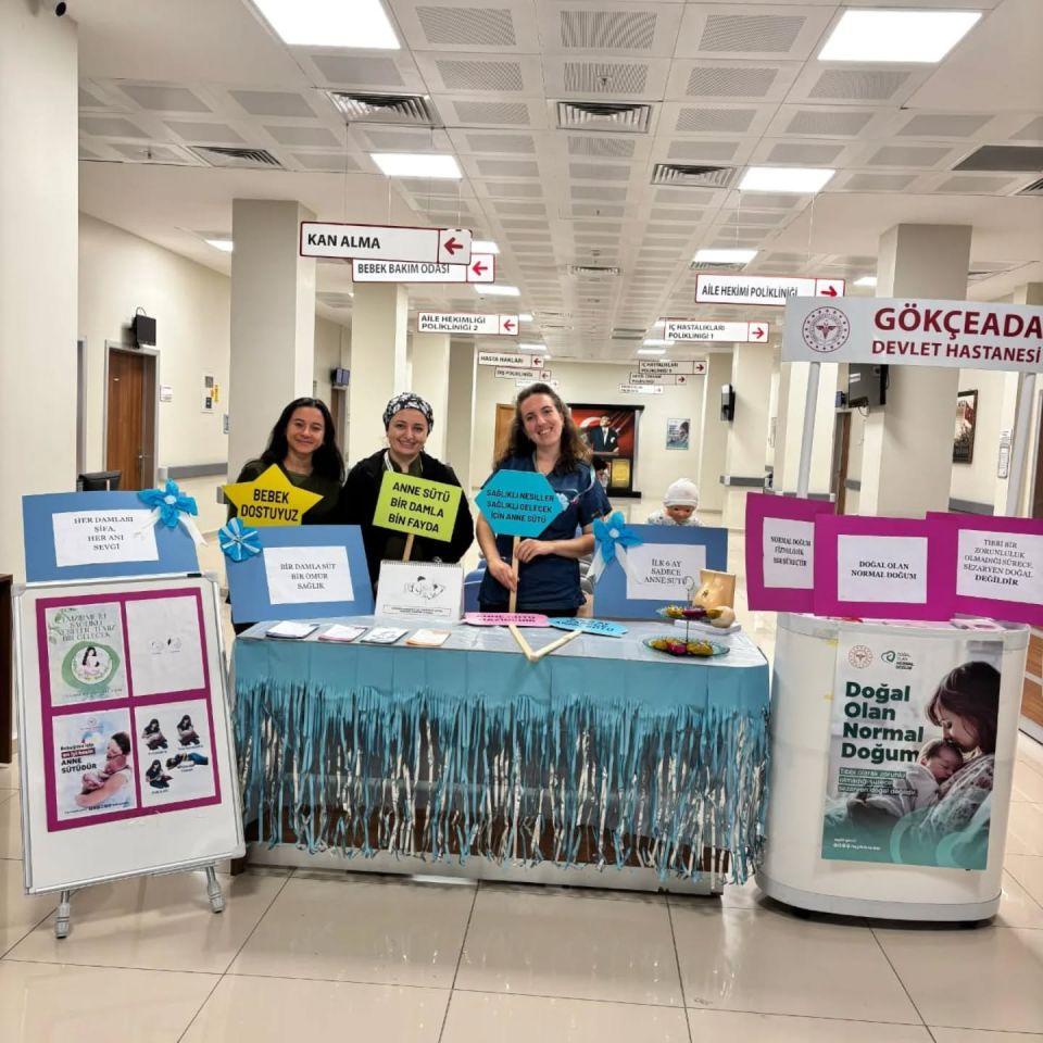 Gökçeada Devlet Hastanesi'nde 1-7 Ekim Normal Doğum Haftası kapsamında Gebe Okulu Koordinatörü Ebe Kübra İzol ve Servis Sorumlusu Ebe Füsun Çamlı tarafından stand çalışması yapılarak; Normal Doğum, Gebe Okulu ve Ebe Polikliniği hakkında bilgilendirmelerde bulunuldu.