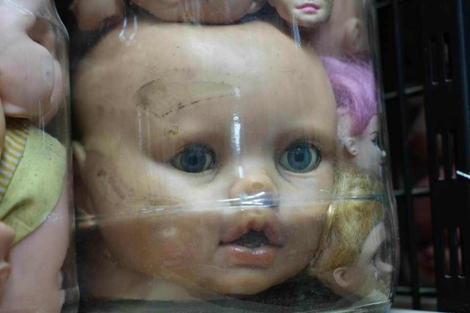 Deposunda çuvalların içinde bekleyen oyuncak bebek kafalarının