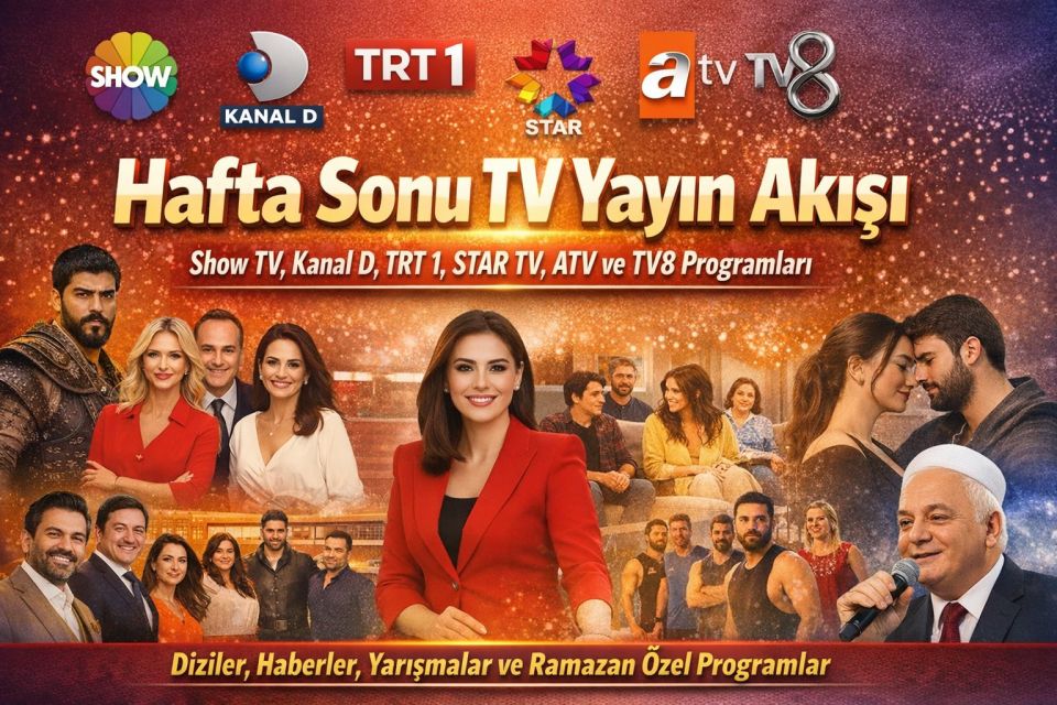 Hafta sonu boyunca televizyon izleyicileri birbirinden farklı içeriklerle buluşacak. Sabah saatlerinden geceye kadar diziler, haber bültenleri, yarışmalar, Ramazan özel programları ve sinema filmleri ekranlarda olacak. Show TV’de “7 Evlat 2 Damat” ve “Güldür Güldür Show”, Kanal D’de “Güller ve Günahlar” ve “Doktor: Başka Hayatta”, TRT 1’de “Gönül Dağı” ve Ramazan özel programları, STAR TV’de “Sefirin Kızı” ve “Boneyard” filmi, ATV’de “Kuruluş Orhan” ve “A.B.İ.”, TV8’de ise “Survivor Ünlüler-Gönüllüler” gibi içerikler izleyiciyle buluşacak. Yayın akışları ile hafta sonunu planlamak isteyenler, programları saat saat takip edebilir ve favori içeriklerini kaçırmadan izleyebilir.