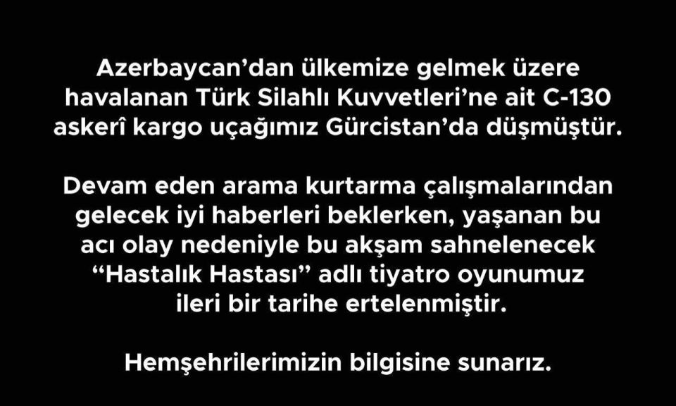 "Azerbaycan’dan ülkemize gelmek üzere havalanan Türk Silahlı Kuvvetleri’ne ait C-130 askerî kargo uçağımız Gürcistan’da düşmüştür. Yaşanan bu acı olay nedeniyle bu akşam sahnelenecek “Hastalık Hastası” adlı tiyatro oyunumuz ileri bir tarihe ertelenmiştir."
