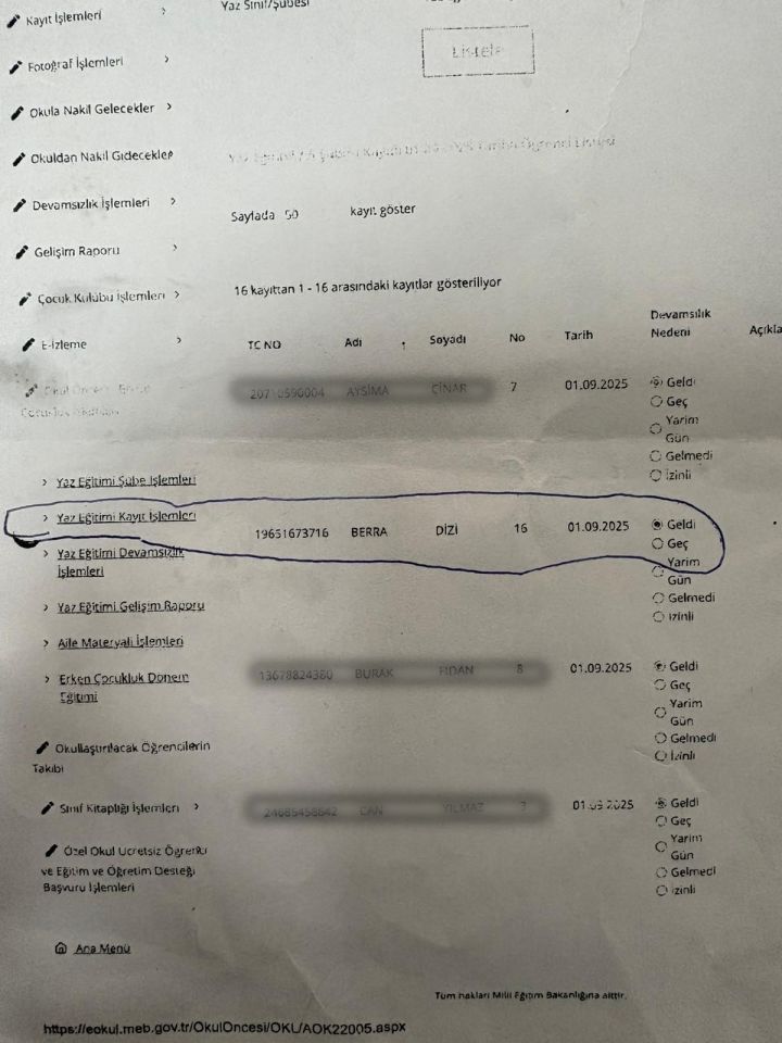 Okul yönetiminin yaz döneminde okula gelen 140 kreş öğrencisini zorunlu oluğu halde Millî Eğitim Bakanlığı Bilişim Sistemleri MEBBİS'e girişlerini yapmadığını ileri süren baba İsmail Dizi okulun, kızının ölüm tarihi olan 12 ağustos 2025 ten tam 21 gün sonra 1 eylül 2025 tarihinde yaz okulunda eğitim gören öğrenci listesini MEBBİS'e girdiğini listede hayatta olmayan kızı Berra Dizi'nin de bulunduğunu ölü kızının 1 eylül tarihinde okula geldi gibi gösterildiğini belgeleriyle anlattı. İsmail Dizi, okul "skandal işler yaparken bilirkişi heyetinde bu işlere bakması gereken öğretmen bu işlere bakmayıp gitmiş bizim çocuğumuzun kesin olmayan ölüm sebebini kendi kafasına göre belirlemiş rapora yazmış. Yönetmeliklerle ilgilenmeyip gidip doktorluk görevi üstlenmiş" dedi.