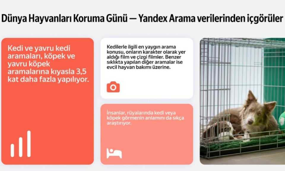Yandex Türkiye tarafından yapılan ve 2024 yılının başından bu yana yapılmış, kediler ve köpeklerle ilgili anonimleştirilmiş arama sorgularına dayanan verilere göre çevrimiçi aramalarda kediler köpeklere göre 3,5 kat daha fazla aranıyor.