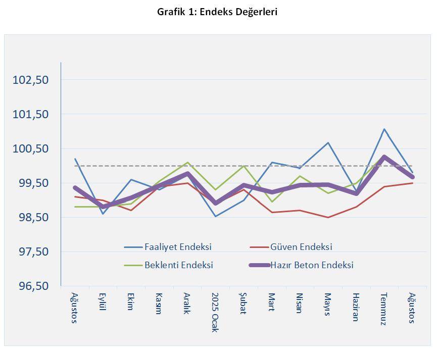 Hazır Beton Endeksi 2025 Ağustos Ayı Raporu’na göre, temmuz ayında yılın en yüksek seviyesini gören Faaliyet Endeksi ağustosta bu pozisyonunu koruyamamış ve eşik değerin altına inmiştir. Beklenti Endeksi temmuz ayındaki pozitif değerinden sonra düşüş göstererek negatif tarafta geçmiştir. Güven Endeksi ise temmuz ayındaki değerine yakın bir noktada, yine eşik değerin altında kalmıştır. Son olarak birleşik Hazır Beton Endeksi, diğer endekslerdeki azalışa paralel olarak düşüş kaydetmiş ve uzun zamandan sonra temmuz ayında üzerine çıktığı eşiğin yeniden altına gerilemiştir.